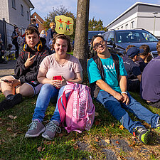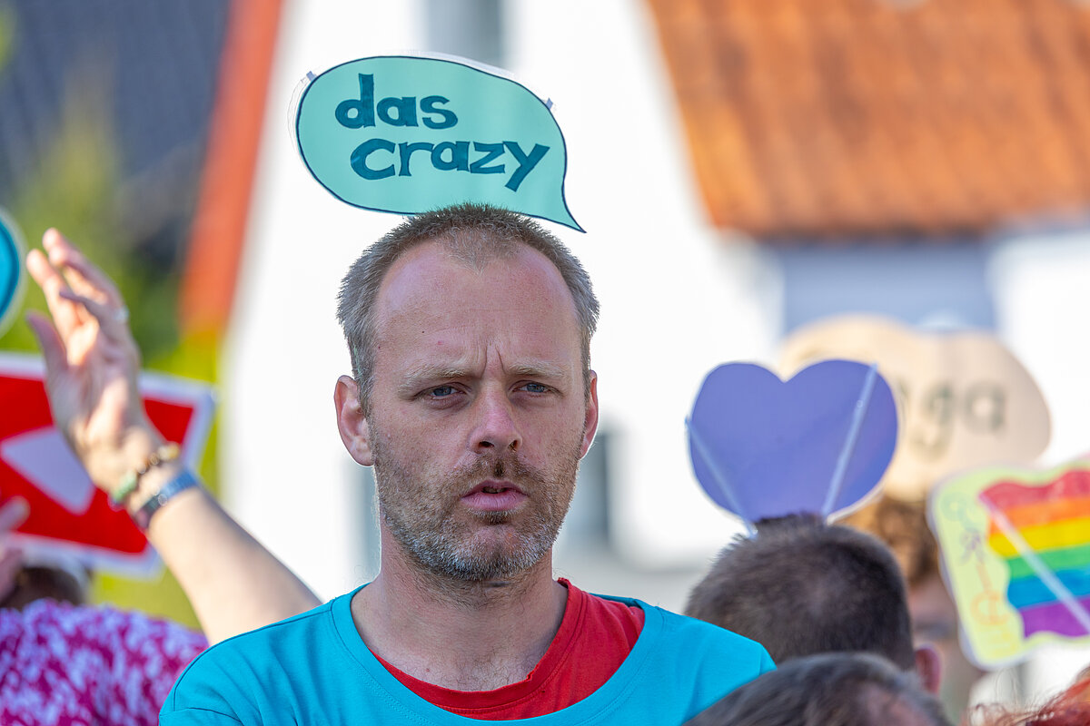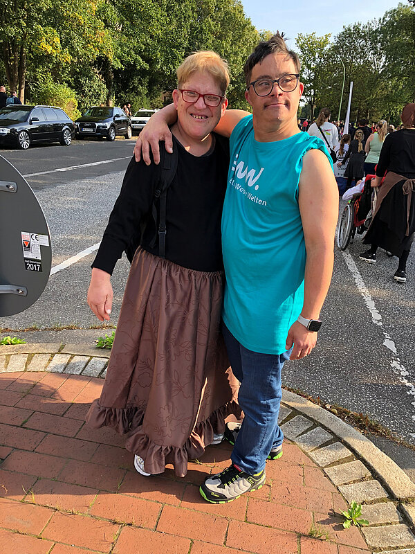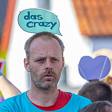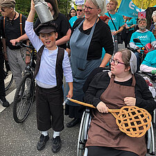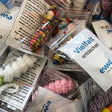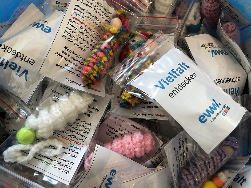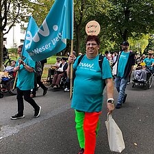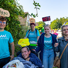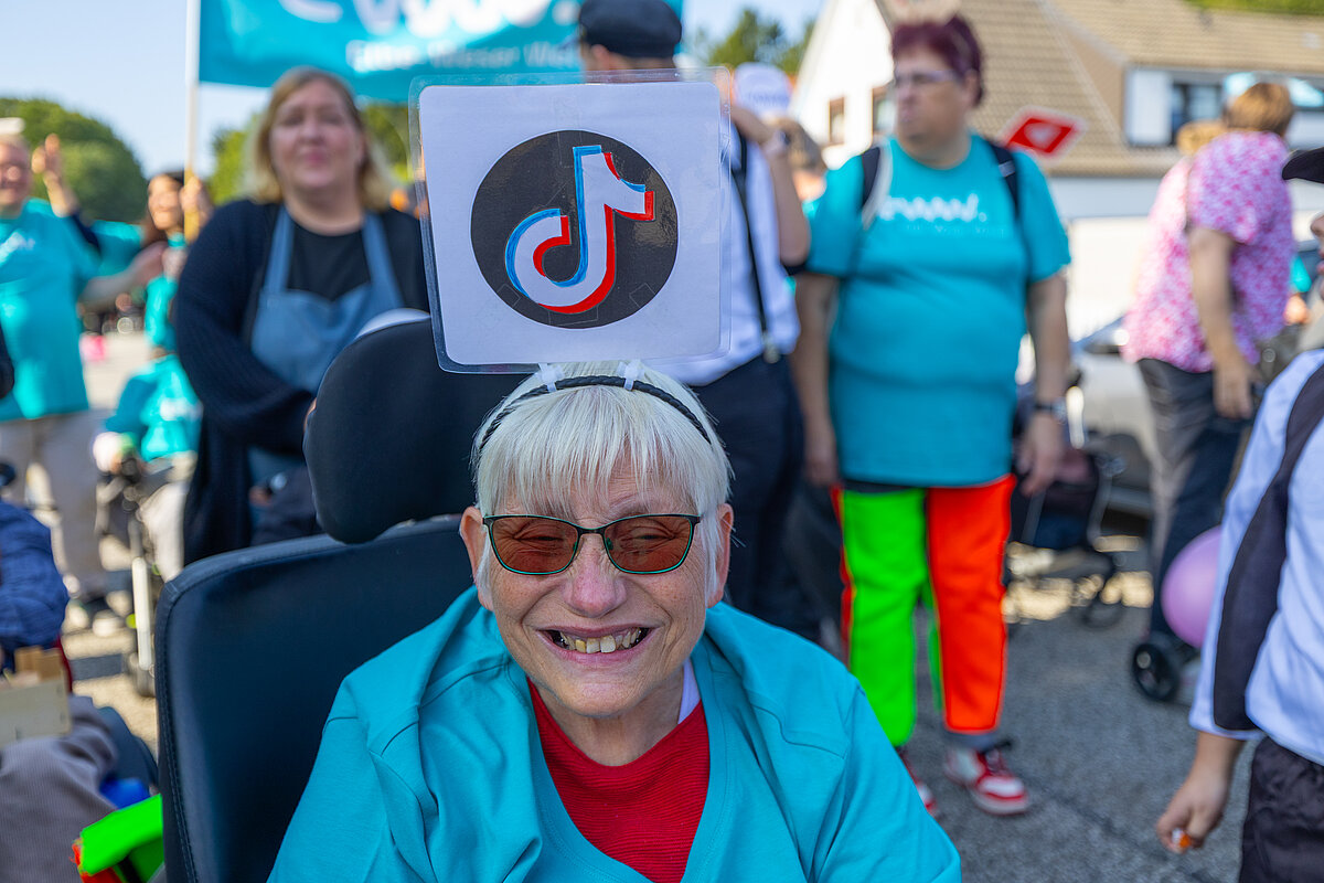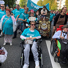 Insgesamt beteiligen sich 60 Nutzer*innen und Mitarbeitende aus dem Wohnbereich an dem 4 km langen Umzug durch den Stadtteil. Am Straßenrand feierten unzählige Schaulustige mit, insbesondere die Kinder freuten sich auf die Bonbons. Dank einer Kollegin aus dem WMH hatten wir nicht nur Süßes zu verteilen, sondern brachten mit sage und schreibe 300 selbstgehäkelten bunten Würmchen auch noch unsere Botschaft von Inklusion und Vielfalt unter die Leute.