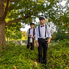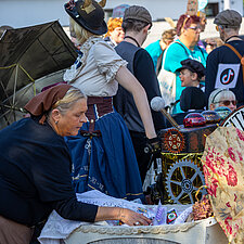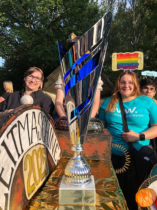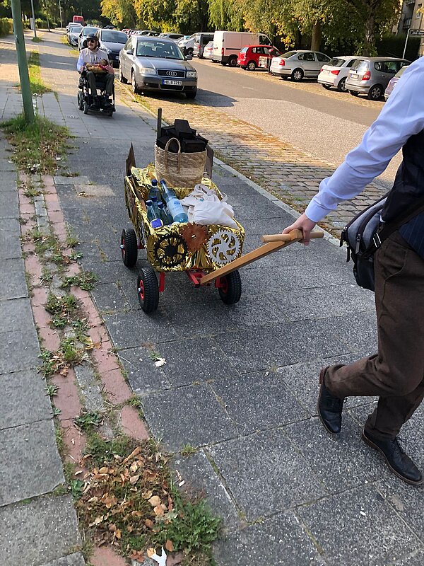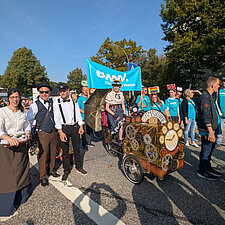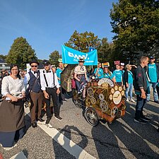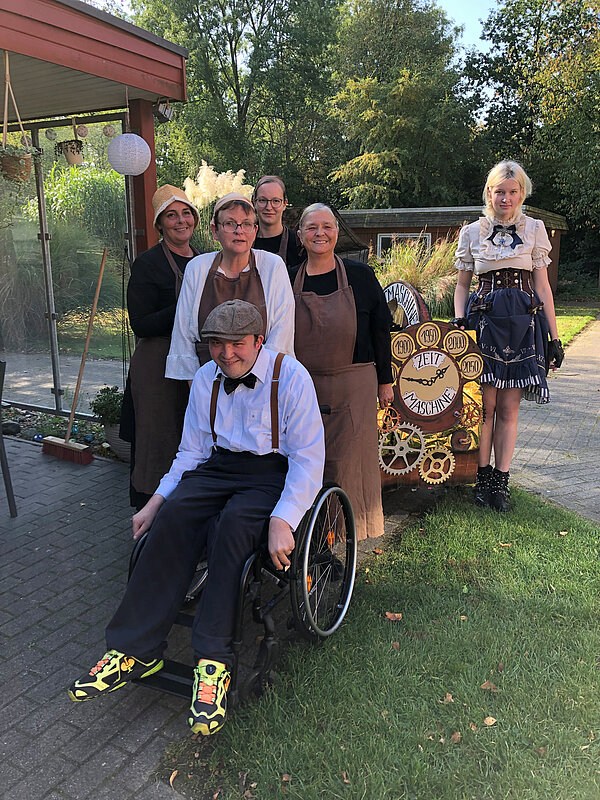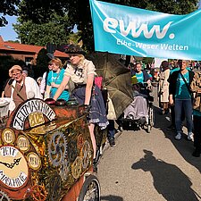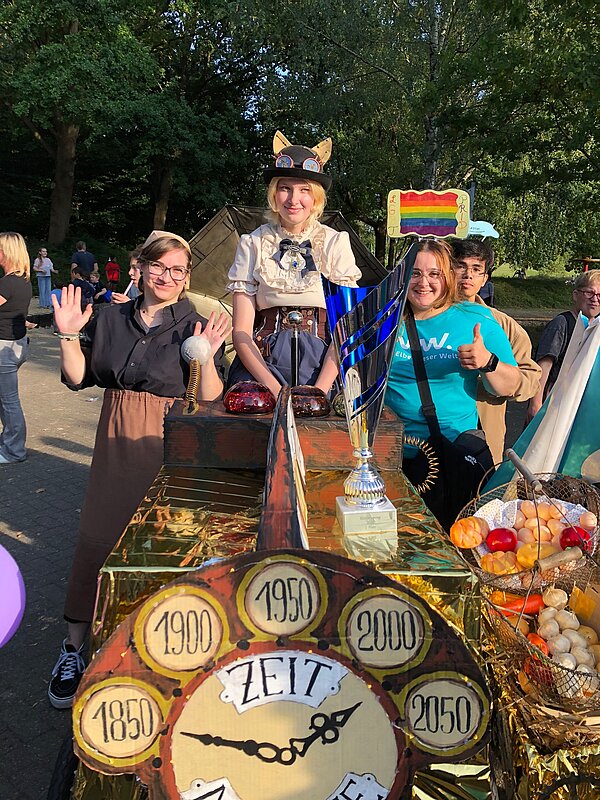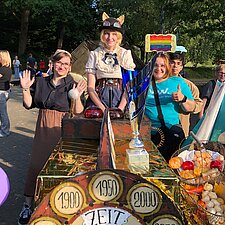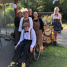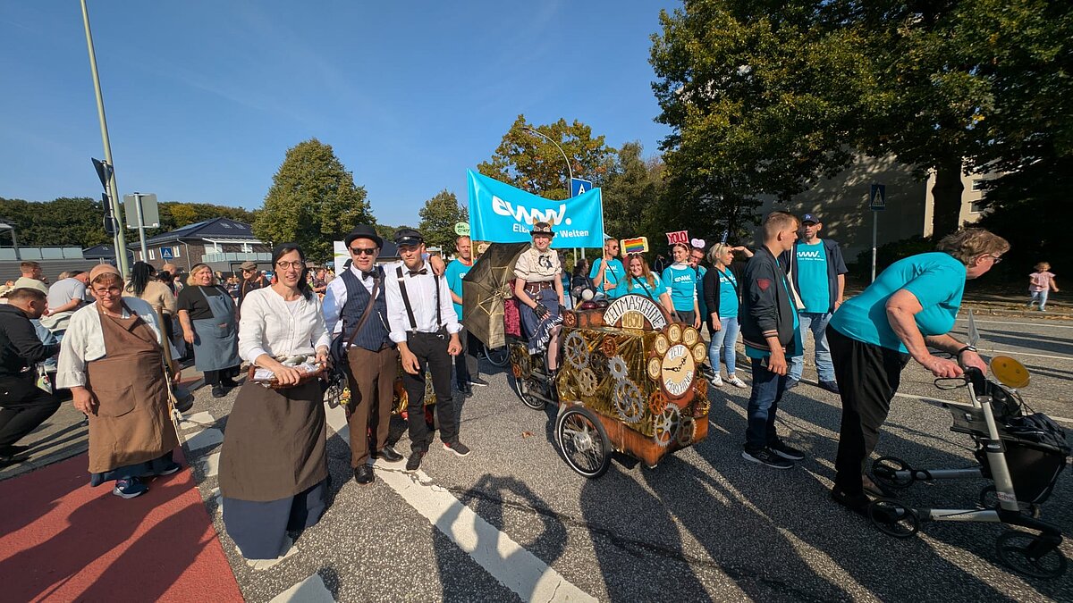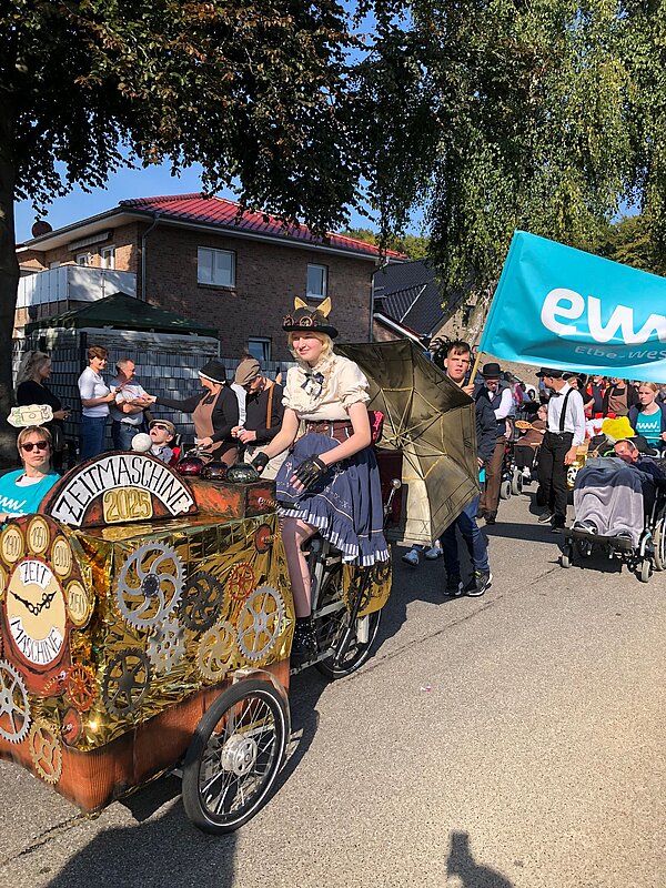175 Jahre Leherheide – der Kulturverein Heidjer Butjer e.V. als Organisator hatte dazu aufgerufen, die Wagen und Kostüme in diesem Jahr ganz unter das Stadtteiljubiläum zu stellen. Damit waren im Fachbereich Wohnen Kreativität und Ehrgeiz geweckt, denn schließlich galt es mindestens den dritten Platz des Kostüm- und Wagen-Wettbewerbs vom letzten Jahr zu verteidigen. Im Vorbereitungsteam stand schnell fest: Wir wollen nicht nur als EWW von heute dabei sein, sondern auch eine Zeitreise ins Jahr 1850 unternehmen - eine Zeitmaschine musste her. Beim WERK. buchten wir ein Lastenrad und dann wurde gebastelt, genäht und gewerkelt.