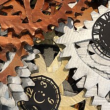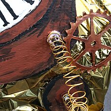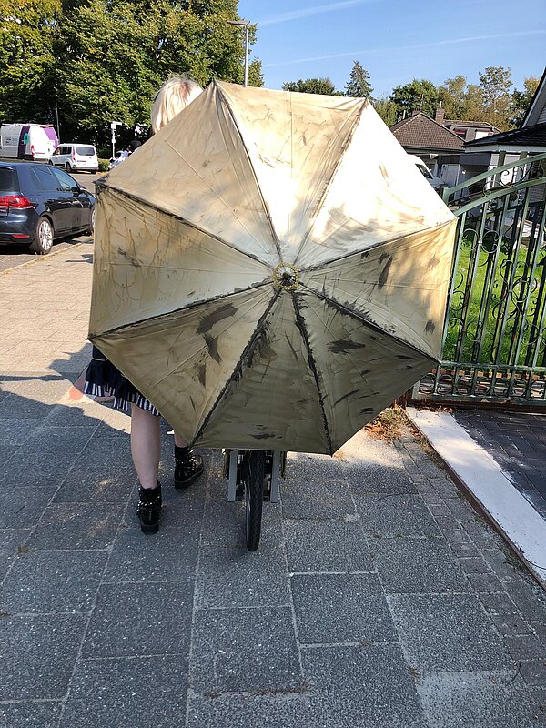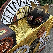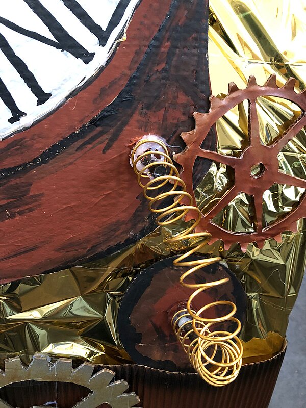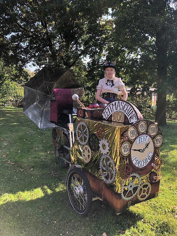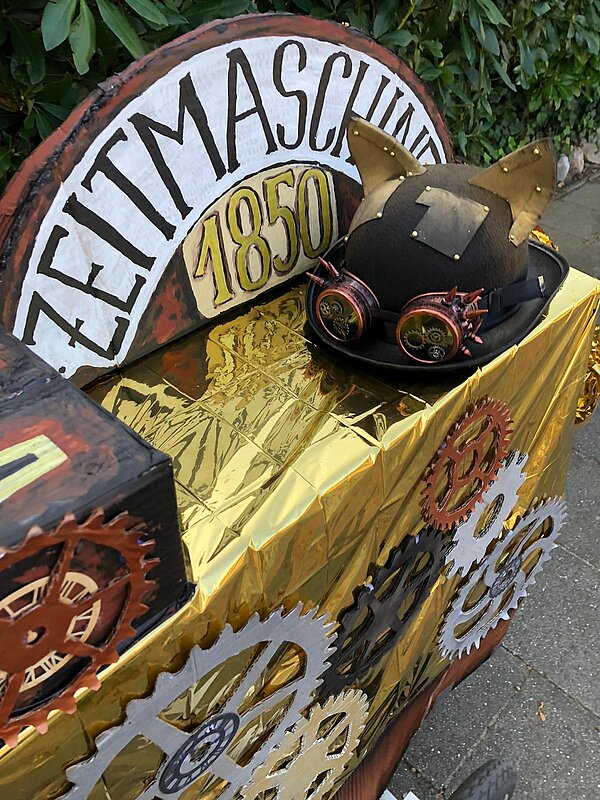 Highlight aber war ohne Zweifel unser Lastenrad: Mit Goldfolie, Zahnrädern, Schirm, Uhrwerk und Leuchten hatten wir es in eine Zeitmaschine verwandelt.