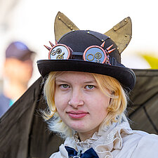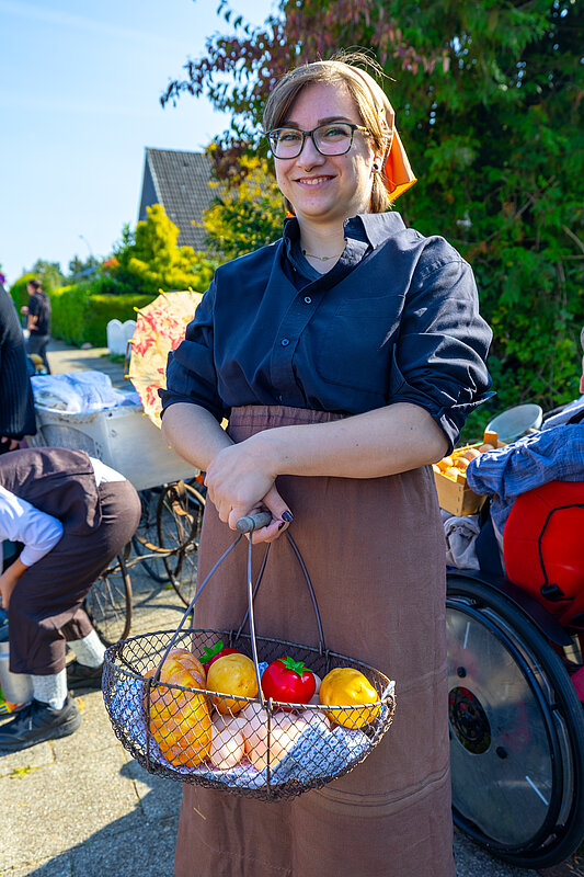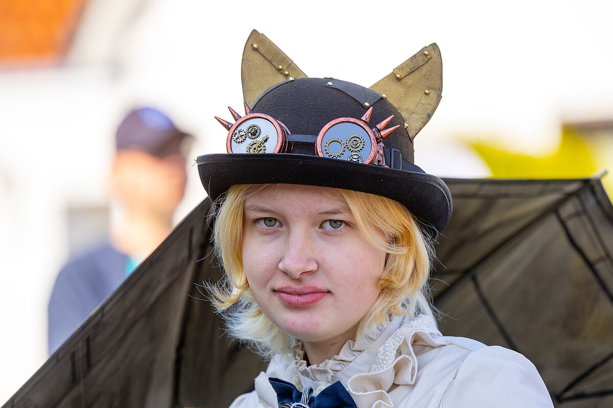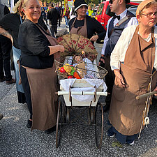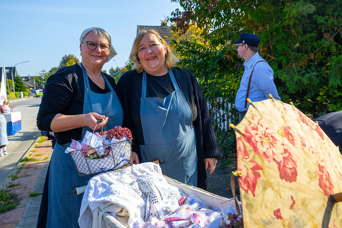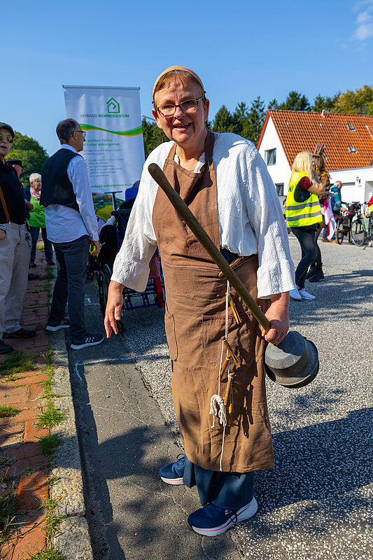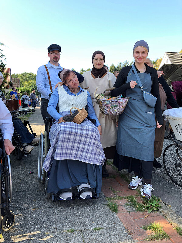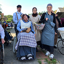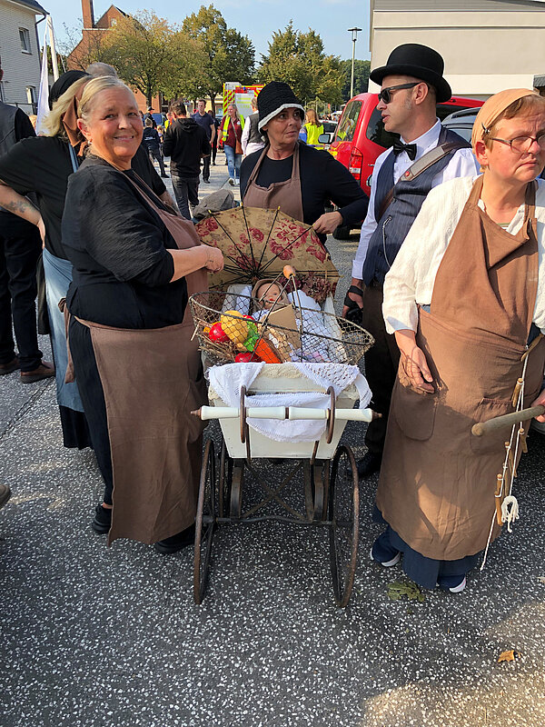 Ein Teil unserer Gruppe zeigte mit EWW-Shirts und kreativem Kopfschmuck die digitale Welt von heute. Eine zweite Gruppe schlüpfte in Kostüme aus dem 19. Jahrhundert und führt zahlreiche Requisiten mit sich, aus der Zeit, als in Leherheide die ersten Siedler sesshaft wurden.