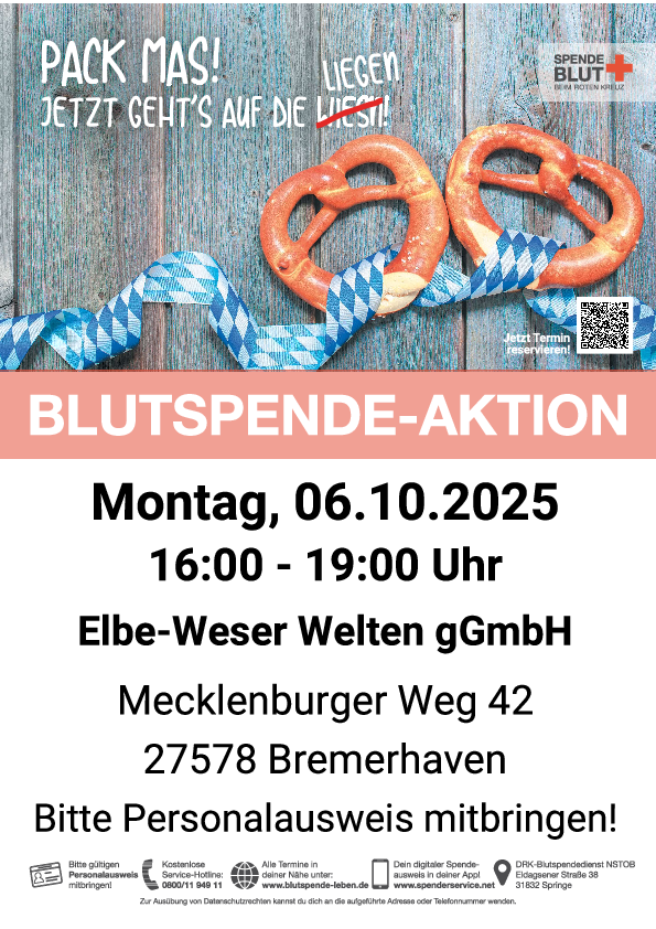 Am Montag, den 6. Oktober 2025, veranstalten die Elbe-Weser Welten gemeinsam mit dem Deutschen Roten Kreuz (DRK) eine Blutspendeaktion in der Kantine (Werk 1) im Mecklenburger Weg 42 in Bremerhaven. Zwischen 16:00 und 19:00 Uhr haben Mitarbeitende, Angehörige sowie interessierte Bürgerinnen und Bürger die Möglichkeit, durch eine Spende aktiv Leben zu retten.