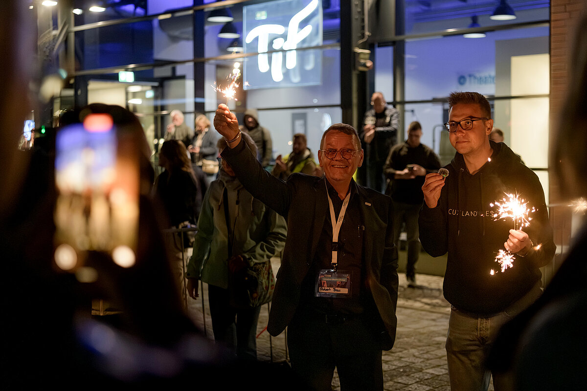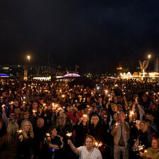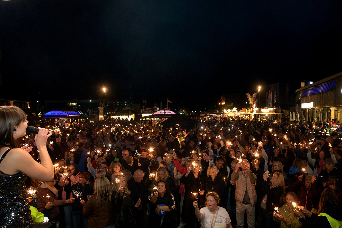 Ein besonderer Höhepunkt des Abends war das große Abschlussbild mit Wunderkerzen: Jede Besucherin und jeder Besucher erhielt Wunderkerzen, sodass zum Finale ein funkelndes Lichtermeer entstand, das den Fischereihafen in eine ganz besondere Atmosphäre tauchte.