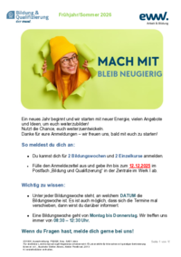 Frühjahr/Sommer 2026 Ein neues Jahr beginnt und wir starten mit neuer Energie, vielen Angebote und Ideen, um euch weiterzubilden! Nutzt die Chance, euch weiterzuentwickeln. Danke für eure…