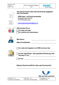 EWW-VO-0155 Version: 4 Seite 1 von 2 Ideen- und Beschwerdebogen Teil 1 Hier können Sie Ihre Idee oder Beschwerde abgegeben oder hinschicken: EWW Ideen- und Beschwerdestelle Mecklenburger Weg 42…